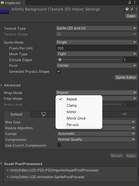 사진을 Import한 후에 Wrap Mode를 Repeat으로 바꿔주셔야 합니다. 그래야 반복이 일어납니다.