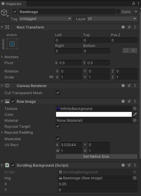 코드를 작성 후 RawImage에 추가했다면 컴포넌트를 붙여주고 X, Y값을 조절해 배경을 스크롤링 해주시면 됩니다.